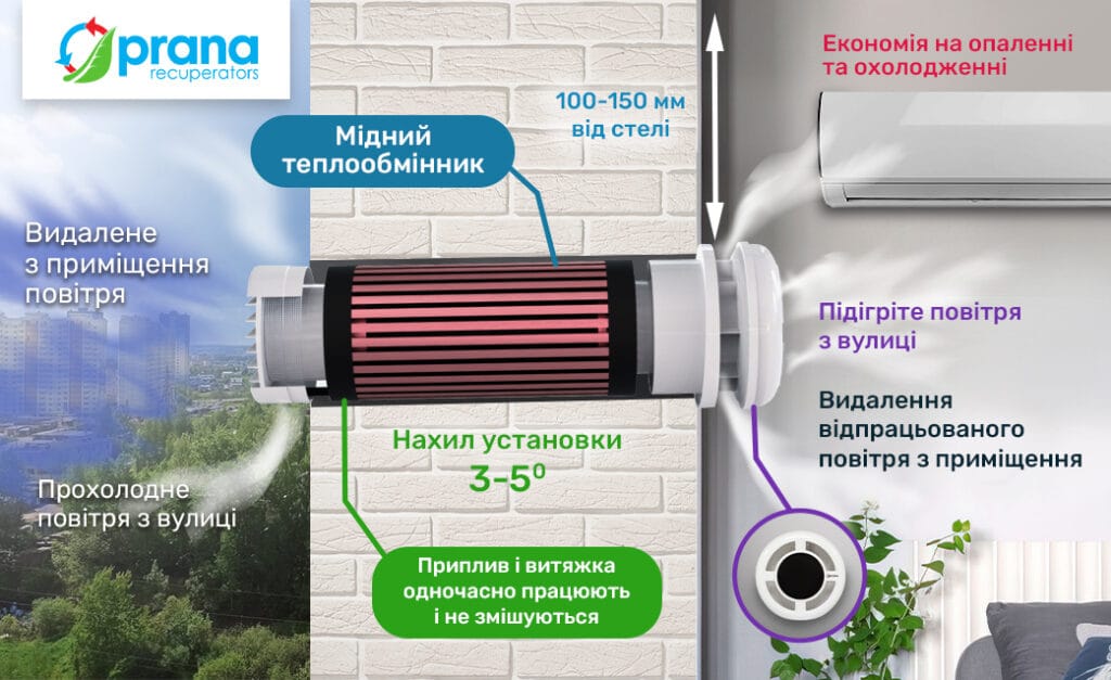 Такі системи, як рекуператори Prana Standart, Eco Life та Eco Energy в увімкненому стані здійснюють обмін повітря між вулицею та приміщенням. Наявність внутрішнього теплообмінника дозволяє нагрівати вуличне повітря за рахунок вихідного потоку, що робить припливне повітря комфортним. Це позитивно позначається на збереженні тепла взимку, а влітку навпаки, вуличне повітря охолоджується.