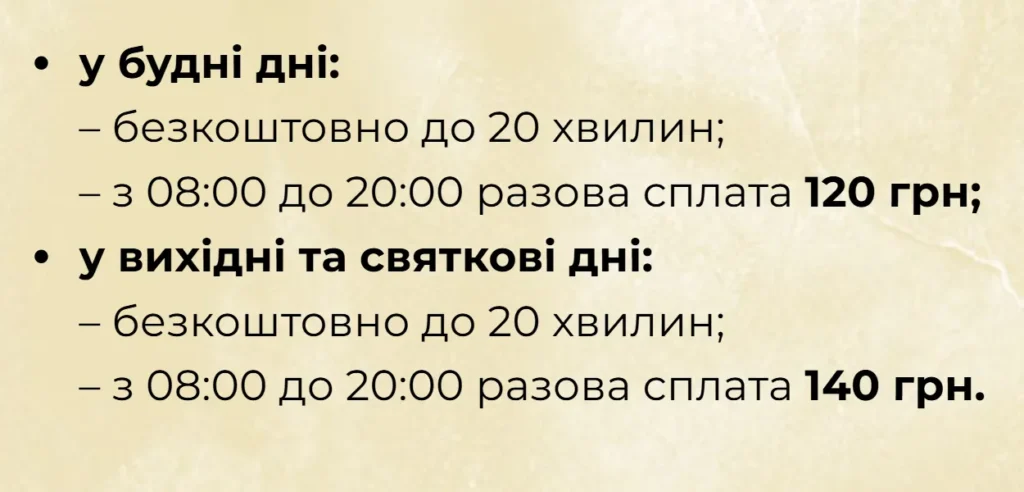 Как уже упоминалось, Киевский зоопарк имеет большой паркинг для автомобилей, который работает круглосуточно. В зависимости от времени стоянки и выбранного дня, пользование имеет такую стоимость: